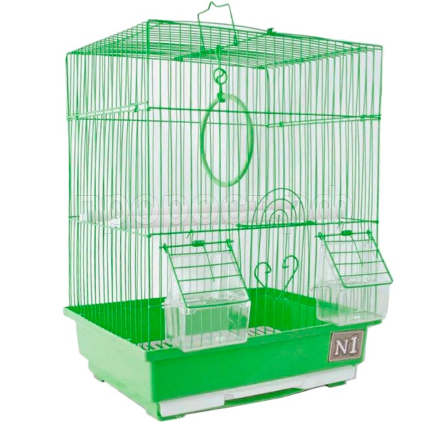 Полностью укомплектована необходимыми аксессуарами - кормушки, жердочки и качелька.